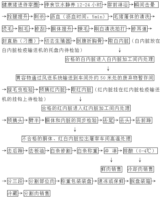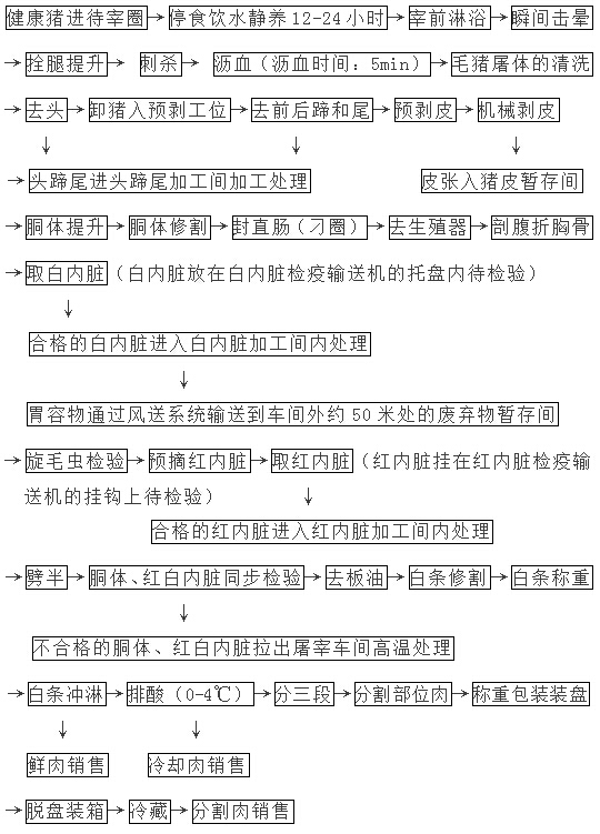 二、生猪屠宰加工工艺1、待宰圈管理(1)活猪进屠宰厂的待宰圈在卸车前,应索取产地动物防疫监督机构开具的合格证明,并临车观察,未见异常,证货相符后准予卸车。(2)卸车后,检疫人员必须逐头观察活猪的健康状况,按检查的结果进行分圈、编号,合格健康的生猪赶入待宰圈休息;可疑病猪赶入隔离圈,继续观察;病猪和伤残猪送急宰间处理。(3)对检出的可疑病猪,经过饮水和充分休息后,恢复正常的可以赶入待宰圈;症状仍不见缓解的,送往急宰间处理。(4)待宰的生猪送宰前应停食静养12-24小时,以便消除运输途中的疲劳,恢复正常的生理状态,在静养期间检疫人员要定时观察,发现可疑病猪送隔离圈观察,确定有病的猪送急宰间处理,健康的生猪在屠宰前3小时停止饮水。(5)生猪进屠宰车间之前,首先要进行淋浴,洗掉猪体上的污垢和微生物,同时也便于处分击晕,淋浴时要控制水压,不要过急以免造成猪过度紧张。(6)淋浴后的生猪通过赶猪道赶入屠宰车间,赶猪道一般设计为“八”型,开始赶猪道可供2-4头猪并排前进,逐渐只能供一头猪前进,并使猪体不能调头往回走,此时赶猪道宽度设计为不大于450mm。2、击晕(1)击晕是生猪屠宰过程中的一重要环节,采用瞬间击晕的目的是使生猪暂时失去知觉,处于昏迷状态,以便刺杀放血,确保刺杀操作工的安全,减少劳动强度,提高劳动生产效率,保持屠宰厂周围环境的安静,同时也提高了肉品的质量。(2)手麻电器是目前小型屠宰厂的常用麻电设备,这种麻电设备在使用前,操作工必须穿戴绝缘的长筒胶鞋和橡皮手套,以免触电,在麻电前应将麻电器的两个电极先后浸入浓度为5%的盐水,提高导电性能,麻电电压:70-90V,麻电星空在线平台:1-3s。(3)三点式自动电击晕机是目前最先进的一种麻电设备,活猪通过赶猪道进入麻电机的输送装置,托着猪的腹部四蹄悬空经过1-2分钟的输送,消除猪的紧张状态,在猪不紧张的情况下瞬间脑、心麻电,击晕星空在线平台:1-3s,击晕电压:150-300v,击晕电流:1-3安培,击晕频率:800赫兹。这种击晕方式没有血斑,没有骨折,延缓PH值的下降,大大改善了猪肉的品质,同时也改善了动物福利。3、刺杀放血(1)卧式放血:击晕后的毛猪通过滑槽滑入卧式放血平板输送机上持刀刺杀放血,通过1-2分钟的沥血输送,猪体有90%的血液流入血液收集槽内,这种屠宰方式有利于血液的收集和利用,也提高了宰杀能力。也是和三点式电击晕机最完美的组合方式。(2)倒立放血:击晕后的毛猪用扣脚链拴住一条后腿,通过毛猪提升机或毛猪放血线的提升装置将毛猪提升进入毛猪放血自动输送线的轨道上再持刀刺杀放血。(3)毛猪放血自动输送线轨道设计距车间的地坪高度不底于3400mm,在毛猪放血自动输送线上主要完成的工序:上挂、刺杀、沥血、猪体的清洗、去头等,沥血星空在线平台一般设计为5min。4、浸烫刨毛(1)烫猪池浸烫:将放血好毛猪通过卸猪器卸入烫猪池的接收台上,慢慢的把猪体滑入烫猪池内浸烫,浸烫的方式有人工翻烫和烫猪机摇烫,烫毛池的水温一般控制在58-62℃之间,水温过高防止把猪体烫白,影响脱毛效果。浸烫星空在线平台:4-6min。在烫猪池的正上方设计“天窗”排出水蒸汽。(2)封闭运河式烫猪池浸烫:将放尽血的猪体由毛猪放血自动输送线通过下坡弯轨自动输送进入运河式烫猪池,在封闭的烫猪池内浸烫4-6min,在输送浸烫过程中要设计压杆压住猪体,防止猪体上浮。浸烫好的毛猪由毛猪自动输送线通过上坡弯轨自动输送出来,这种烫猪池的保温效果好。(3)隧道式蒸汽烫毛系统:将放尽血的毛猪悬挂在毛猪放血自动输送线上进入隧道烫毛,这种烫毛方式大大降低了工人的劳动强度,提高了工作效率,实现毛猪烫毛的机械化操作,同时避免了猪体间交叉感染的弊端,使肉质更加卫生。这种烫毛方式是目前最先进、最理想的烫毛形式。(4)卧式刨毛:这种刨毛方式主要采用100型刨毛机、200型机械(液压)刨毛机、300型机械(液压)刨毛机,用捞耙把浸烫好的毛猪从烫猪池内捞出自动进入刨毛机内,通过大滚筒的翻滚和软刨爪的刮毛把猪体的猪毛刨净,然后再将刨好的猪体放出来进入修刮输送机或清水池内修刮。(5)螺旋自动刨毛:这种形式的刨毛和运河烫、隧道式蒸汽烫配套使用,浸烫好的毛猪从放血自动输送线上通过卸猪器卸下进入刨毛机内,通过软刨爪的刮毛和螺旋推进的方式将刨毛后的猪体从刨毛机的另一端推出来,进入修刮输送机上进行修刮。5、机械剥皮(1)毛猪在放血自动输送线上去头后,通过卸猪器卸下进入预剥输送机上,在预剥输送机上进行去前蹄、去后蹄和预剥皮等作业。(2)把预剥后的猪输送到剥皮工位,用剥皮机的夹皮装置夹住猪皮通过机械剥皮机的滚筒旋转将猪体的整张猪皮剥下,剥下的猪皮自动输送或用皮张车运输到皮张暂存间。6、胴体加工(1)胴体加工工位:胴体修割、封直肠、去生殖器、剖腹折胸骨、去白内脏、旋毛虫检验、预摘红内脏、去红内脏、劈半、检验、去板油等,都是在胴体自动加工输送线上完成的,胴体线的轨道设计距车间地坪的高度不底于2400mm。(2)刨毛或剥皮后的胴体用胴体提升机提升到胴体自动输送线的轨道上,刨毛猪需要燎毛、刷白清洗;剥皮猪需要胴体修割。(3)打开猪的胸腔后,从猪的胸膛内取下白内脏,即肠、肚。把取出的白内脏放入白内脏检疫输送机的托盘内待检验。(4)取出红内脏,即心、肝、