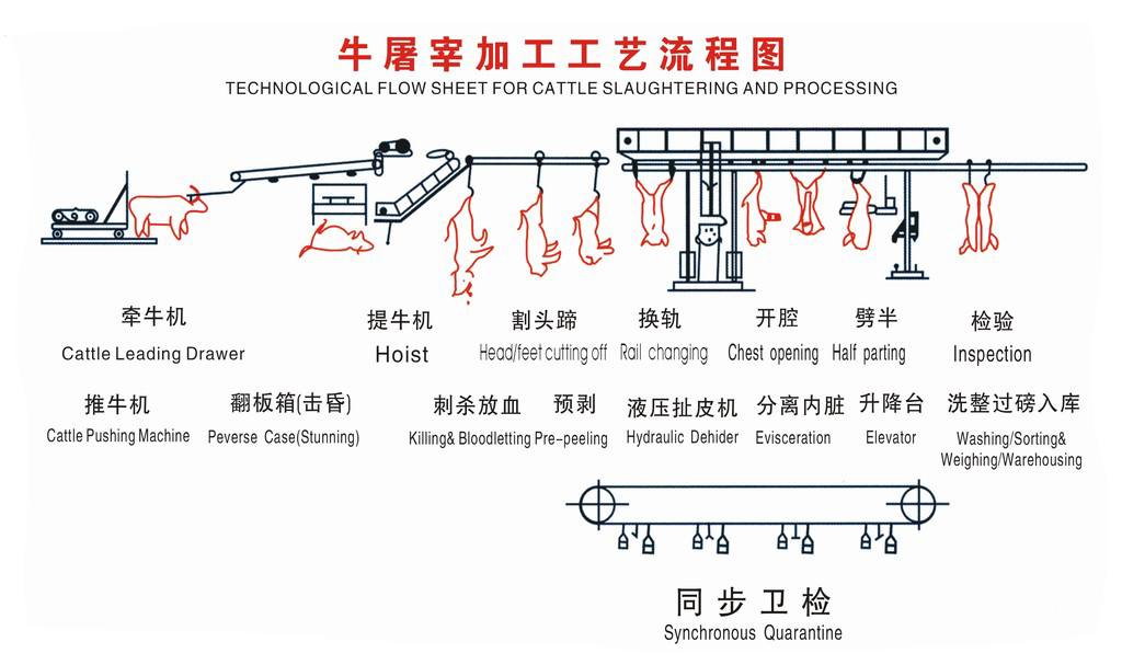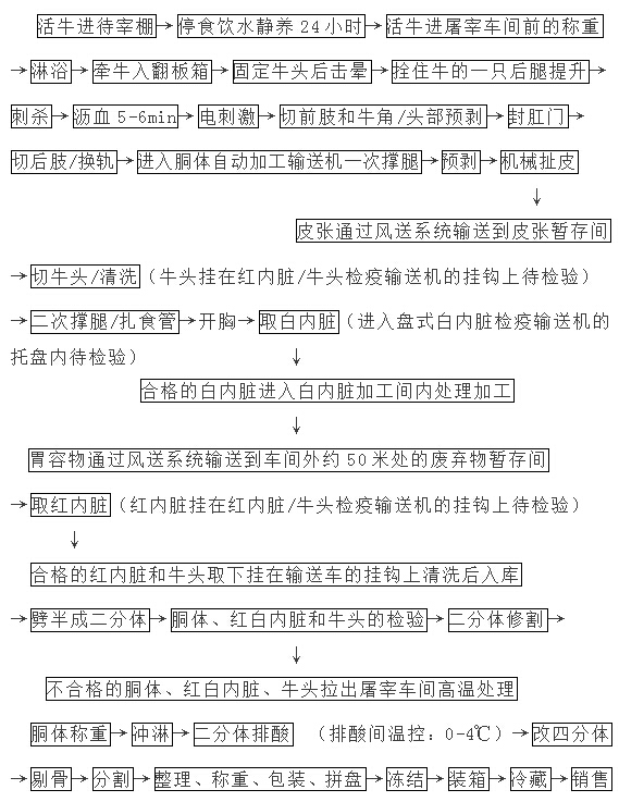 二、肉牛屠宰加工工艺1、待宰圈管理(1)、卸车前应索取产地动物防疫监督机构开具的合格证明,并临车观察,未见异常,证货相符后准予卸车。(2)、经清点头数,用轻拍或牵引的方式驱赶健康的牛进入待宰圈,按牛的健康状况进行分圈管理。待宰圈的占地面积按每头牛3-4㎡设计。(3)、待宰的牛送宰前应停食静养24小时,以便消除运输途中的疲劳,恢复正常的生理状态,在静养期间检疫人员定时观察,发现可疑病牛送隔离圈观察,确定有病的牛送急宰间处理,身体健康合格的牛在宰前3小时停止饮水。(4)、牛在宰之前,要进行淋浴,洗掉牛体上的污垢和微生物,淋浴时要控制水压,不要过急以免造成牛过度紧张。(5)、牛在进赶牛道前,要称重计量,称重好的牛进入赶牛道,从动物的福利和人道角度讲,牛不能采取暴力驱赶的方式,暴力驱赶造成应急反应,影响牛肉的品质,要设计“迷道”的形式让牛自觉的进入屠宰车间。赶牛道道宽一般设计为900-1000mm。2、刺杀放血(1)、活宰:牛进入翻板箱后,利用二次气动侧翻的形式,第一次侧翻放出牛腿,用拴牛腿链拴住牛的一只后腿,第二次侧翻放出整头牛体,通过提升机提升进入放血轨道,牛在轨道上倒挂进行刺杀放血。(2)、卧式/倒立放血:牛进入翻板箱后,采用击晕的方式将牛瞬间击晕,击晕后放出牛体,平躺在接牛栏上刺杀放血或挂在放血轨道上刺杀放血。(3)、立式放血:牛进入翻板箱后,夹住牛脖子,托起牛的下颚,持刀刺杀放血,放完血后,放出牛体通过提升机提升进入放血轨道。(4)、牛通过放血提升机进入轨道时,要自动打开轨道,将滚轮放血吊链挂在轨道上,放血轨道设计距车间的地坪高度为5100mm。如是手推线轨道,手推线设计坡度为0.3-0.5%。(5)、在放血线上主要完成的工序:上挂、刺杀、沥血、电刺激、切牛前腿和牛角、封肛门、切牛后腿等。沥血星空在线平台一般设计为5-6min。3、转挂和预剥(1)、牛在放血轨道上是用放血吊链拴住牛的一只后腿,牛的后腿切割后,用转挂提升机勾住管轨滚轮吊钩的钩柄,再用滚轮吊钩的钩子勾住已切去后腿的后肢上,提升机提升后放出牛的另一后腿,再用滚轮吊钩勾住,挂在胴体加工线的手推轨道上。胴体加工自动输送线轨道距车间地坪高度设计为4050mm。(2)、放血吊链通过返回系统的轨道回到牛的上挂位置。(3)、牛进入胴体加工输送机时,通过气动提升和拨叉自动撑开双后腿,第一次撑腿间距设计为500mm,进入胴体加工输送机的工位操作。胴体加工输送机的工位间距:2100mm或2400mm(4)、撑开双腿后的牛体进行预剥,用剥皮刀或气动剥皮刀进行后腿、胸部、前腿的预剥。4、扯皮加工(1)、将预剥好的牛自动输送到扯皮工位,用拴牛腿链把牛的两前腿固定在拴牛腿架上。(2)、扯皮机的扯皮滚筒,通过液压作用上升到牛的后腿位置,用牛皮夹子夹住已预剥好牛皮,从牛的后腿部分往头部扯,在机械扯皮过程中,两边操作人员站在单柱气动升降台进行修割,直到头部皮扯完为止。(3)、牛皮扯下后,扯皮滚筒开始反转,通过牛皮自动解扣链将牛皮自动放入牛皮风送罐内。(4)、气动闸门关闭,往牛皮风送罐内充入压缩空气,将牛皮通过风送管道输送到牛皮暂存间。5、胴体加工(1)、胴体加工工位:切牛头、扎食管、开胸、取白内脏、取红内脏、劈半、胴体检验、胴体修割等,都是在胴体自动加工输送机上完成的。(2)、切下牛头,放在牛头清洗装置的案板上,把牛的舌头割出来,将牛头挂在牛头清洗器的挂钩上,用高压水枪清洗牛头,清洗好的牛头挂在红内脏/牛头同步检疫输送机上待检验。(3)、用食管结扎器将牛的食管扎住,防止胃容物流下,污染牛肉。进入二次撑腿装置,二次撑腿把牛的两后腿从500mm撑到1000mm,以便下道工序。(4)、用开胸锯打开牛的胸膛。(5)、从牛的胸膛里扒下白内脏,即肠、肚。把取出的白内脏落入下面的气动白内脏滑槽,将白内脏通过滑槽滑入盘式白内脏检疫输送机的大卫检盘内待检验,气动白内脏滑槽再经过冷-热-冷水的清洗消毒。(6)、取出红内脏,即心、肝、肺。把取出的红内脏分别挂在红内脏/牛头同步检疫输送机的挂钩上待检验。(7)、用带式劈半锯沿牛脊椎骨把牛劈成两个二分体。在劈半前面设计劈半防溅屏,以防骨沫飞溅。(8)、把牛的二分体进行内外修割。修割好的二分体脱离胴体自动加工输送机进入胴体称重系统进行称重。6、同步卫检(1)、牛胴体、白内脏、红内脏和牛头通过检疫输送机同步输送到检验区采样检验。(2)、由检验人员进行胴体检验,疑病胴体通过气动道岔进入疑病胴体轨道。(3)、检验不合格的白内脏由气动白内脏分离装置分离出来,倒入封闭的车内拉出屠宰车间处理。(4)、检验不合格的红内脏和牛头,摘下钩放入封闭的车内拉出屠宰车间处理。(5)、红内脏/牛头同步检疫输送机的挂钩和盘式白内脏检疫输送机的卫检盘自动通过冷-热-冷水的清洗和消毒。7、副产品加工(1)、合格的白内脏通过白内脏滑槽进入白内脏加工间,将肚和肠内的胃容物倒入风送罐内,充入压缩空气将胃容物通过风送管道输送到屠宰车间外约50米处,牛肚和百叶有洗牛肚机进行烫洗。(2)、合格的红内脏和牛头从红内脏/牛头同步检疫输送机的挂钩上摘下来,挂在红内脏车的挂钩上推到红内脏间内,清洗后进入冷库。8、二分体排酸(1)、将修割、冲洗好的二分体推进排酸间进行“排酸”,排酸的过程即是牛肉