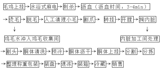 二、肉鸡屠宰加工工艺 1、毛鸡输送 (1)卸车前应索取产地动物防疫监督机构开具的合格证明,并临车观察,未见异常,证货相符后准予卸车。 (2)将装有毛鸡的鸡笼从运输车上搬运下来,放在挂鸡月台上,由检疫人员现场检验。检验合格健康毛鸡的鸡笼放在鸡笼输送机上,输送到毛鸡上挂间。 (3)毛鸡上挂间和屠宰车间严格分开,毛鸡上挂间尽量设计阴暗,避免强光照射,造成毛鸡拍打翅膀过度紧张。 (4)挂鸡人员从鸡笼里托着鸡腹拿出毛鸡,再将两鸡爪挂在生产流水线的挂架上。每个挂鸡人员每小时可挂毛鸡800-1000只。 (5)回空的鸡笼由输送机自动输送进入鸡笼清洗机内进行鸡笼的清洗,清洗干净的鸡笼通过鸡笼斜滑道滑到卸鸡月台上。2、肉鸡宰杀脱毛 (1)肉鸡宰杀高架输送线主要完成的工序:毛鸡上挂、水浴式麻电、刺杀、沥血、烫毛、脱毛、切爪、转挂等。 (2)高架输送线挂架间距:6英寸(152.4mm),采用标准驱动链条,链条节距t=25.4mm,变频调速,生产线的设计宰杀能力和生产线的线速度密切相关,线速度的计算式:线速度=时产量 (只/小时)×挂架间距(米)÷60(分钟/小时) 例如:设计能力:3000只/小时,挂架间距:152.4mm 生产流水线的线速度:3000只/小时×0.1524米÷60分钟/小时=7.62米/分钟。 (3)活鸡麻电通常采用水浴式麻电,麻电电压:70-90V,麻电星空在线平台:2-3s。或不通过麻电工序,采用毛鸡上挂后通过高架输送线自动输送1min,让毛鸡平静下来后再刺杀。 (4)毛鸡刺杀后沥血,沥血星空在线平台一般设计为3-4min。烫毛星空在线平台:40-60s,脱毛星空在线平台:15-30s。 (5)烫毛采用恒温烫毛机,烫毛温度:58-62℃。脱毛尽量采用吊挂式脱毛,避免胴体相互接触而造成交叉感染。 (6)在90°的转弯处设计自动切爪机,切爪机由定位轮、驱动、旋转刀片组成,鸡爪切割后,鸡爪再由卸爪器卸下放入收集车内。3、膛掏内脏 (1)肉鸡开膛掏内脏高架输送线主要完成的工序:开膛、掏内脏、切头、胴体清洗等。 (2)该高架输送线挂钩间距:8英寸(203.2mm),采用标准驱动链条,链条节距t=25.4mm,变频调速。 (3)将掏出的内脏放入内脏滑槽内,由检疫人员检验,检验合格的鸡胴体进入下道工序。检验合格的鸡内脏进入内脏加工间处理,不合格胴体和内脏放入封闭的小车内拉出屠宰车间处理。 (4)内脏通过分离,鸡肠通过清洗整理后入冷库冷藏,鸡胗用鸡胗脱脂机把鸡胗表面的油脂脱下来,再由剥胗机把胗皮剥下来,清洗整理后入冷库冷藏。 (5)去内脏后的胴体在预冷之前必须进行清洗,去除体内的血水。4、预冷 (1)预冷分池预冷和螺旋预冷机预冷。池预冷占用的面积比预冷机预冷要大。 (2)预冷水温:0-2℃,预冷星空在线平台:45min。 (3)预冷好的胴体要通过沥干机或高架输送线将体内的水沥干。 (4)预冷后的鸡胴体中心温度在10℃以下。5、分割包装 (1)分割高架输送线挂钩间距:8英寸(203.2mm),采用标准驱动链条,链条节距t=25.4mm,变频调速。 (2)在高架输送线上由分割操作人员分割不同的部位肉,把分割肉放在平板输送机上传送到分拣工位进行分拣。 (3)把分拣后的部位肉根据要求称重后真空包装,放入冷冻盘内用凉肉架车推到结冻库(-30℃)结冻或到成品冷却间(0-4℃)保鲜。 (4)将结冻好的产品脱盘后装箱,进冷藏库(-18℃)储存。 (5)分割包装间温控:10-15℃。